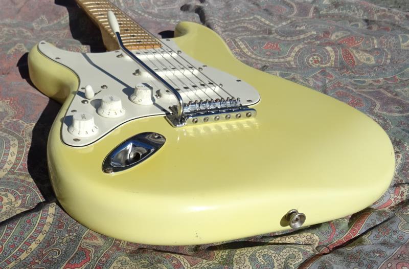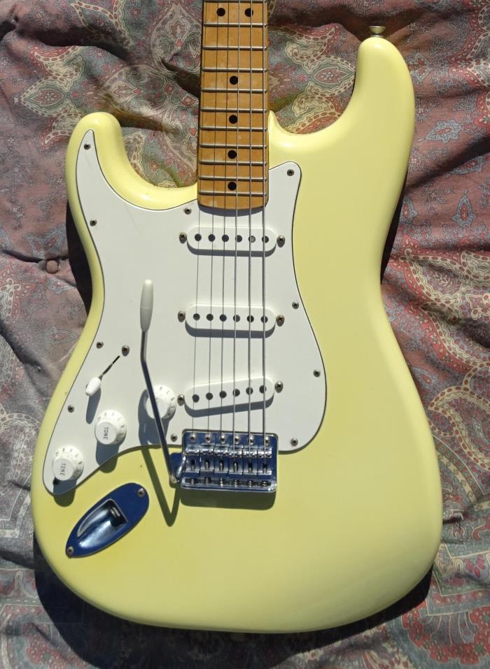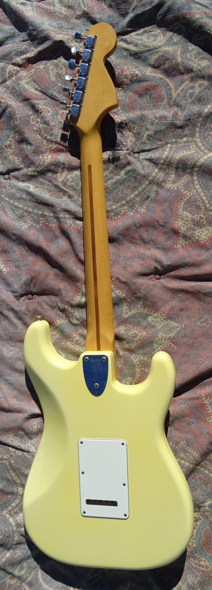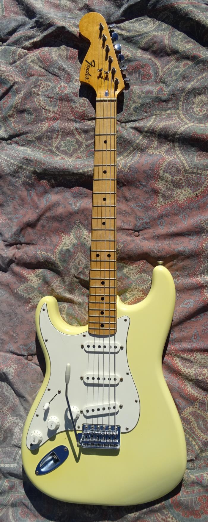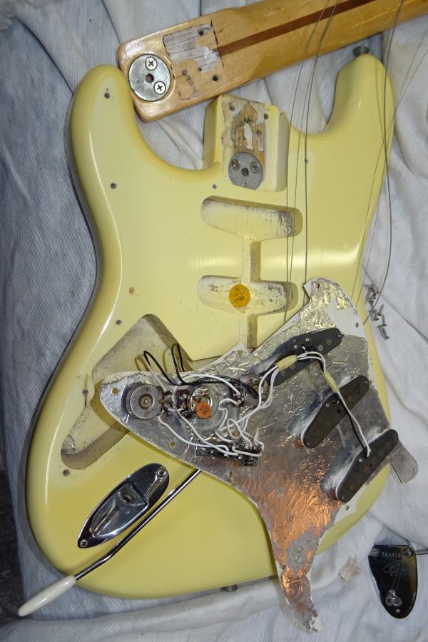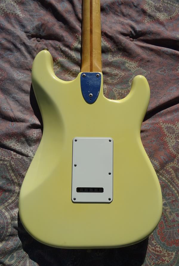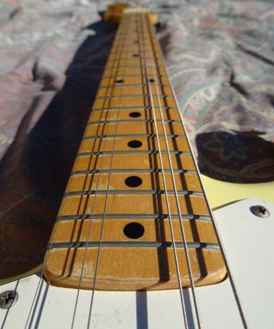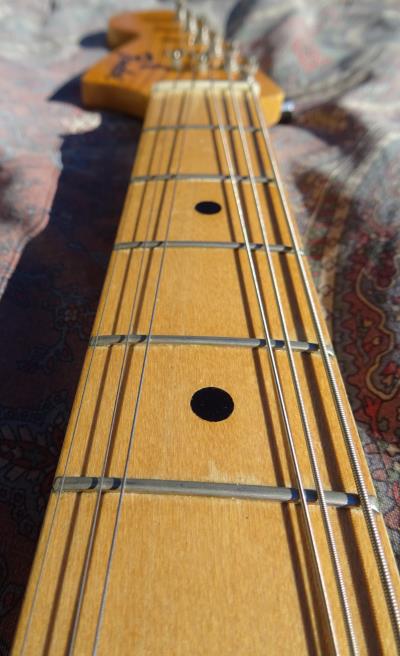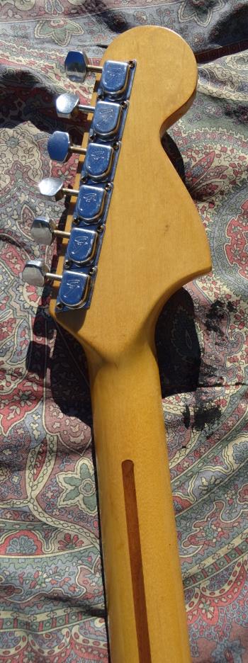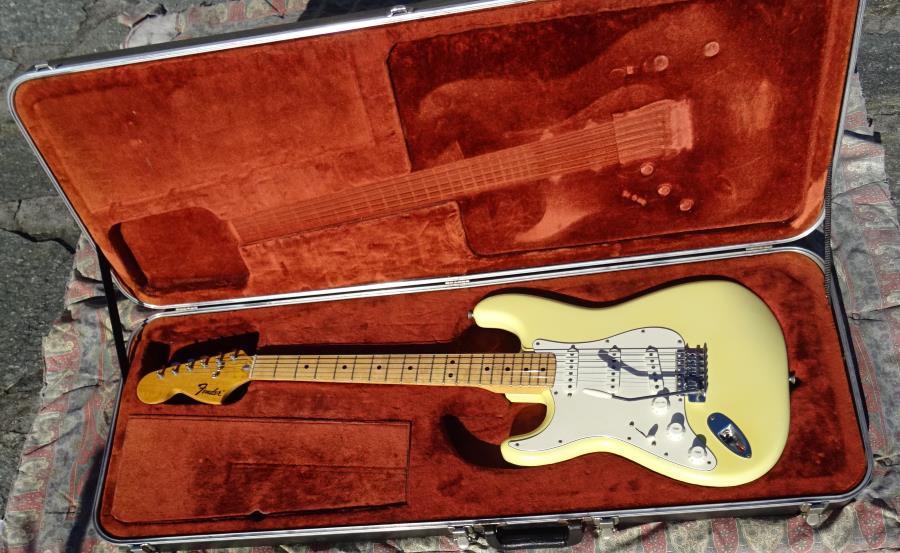 All original, pickups, pots, tuners, tremolo etc. repro back tremolo cover springs, retro pickguard added aluminum foil, frets in very good conditions, working truss rod, straight neck with low actions, Strong Sound ! come with Fender molded case.