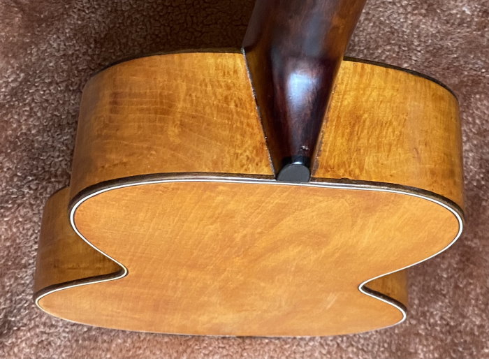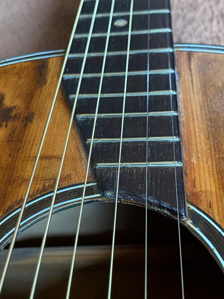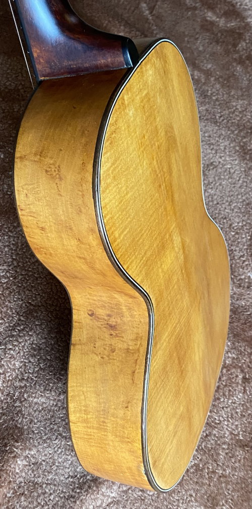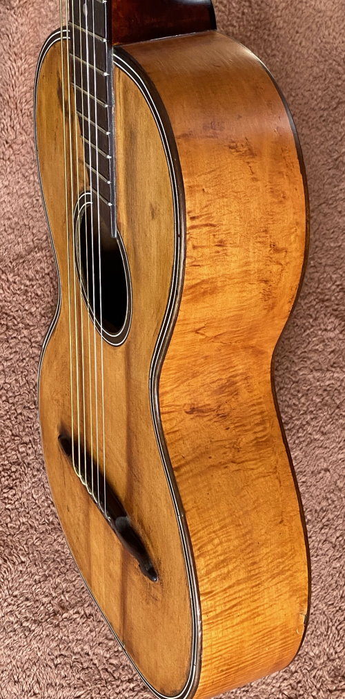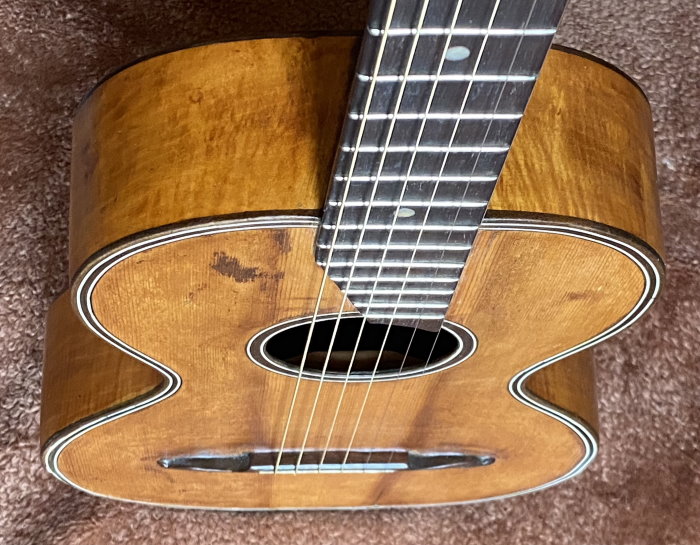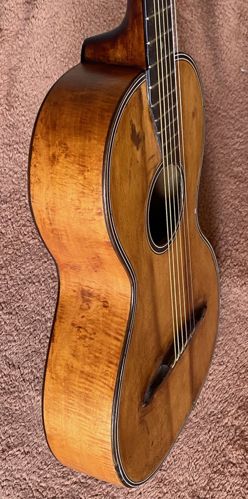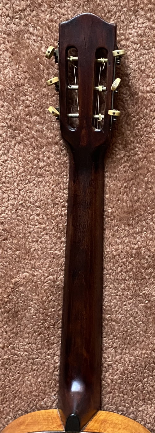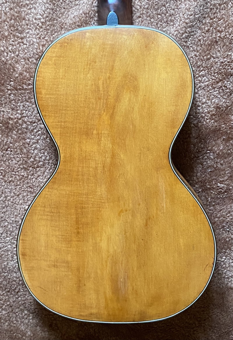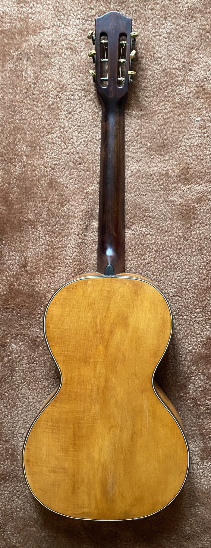 Beautiful romantic guitar fully functional. The sound is stunningly beautiful, warm, and rich in overtones. The guitar responds very well and has excellent sustain. The instrument has been completely refurbished professionally repaired. Now all guitar is stable and will withstand another eventful life. New strings fitted. During the refurbishment, great care was taken to preserve the unique patina. Neck is traight and frets in very good conditions. The guitar plays easily with a correct action and a straight and comfortable neck. Solid spruce top, Rosewood fingerboard, Solid maple neck back and sides, Rosewood bridge. Wooden binding around top and sound hole. No label inside, a very beautiful guitar inspired by the famous master guitars of Stauffer! This beautiful guitar has an amazingly beautiful sound and a rousing, warm, soft articulation. The tones are lively and deeply expressive.