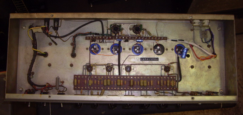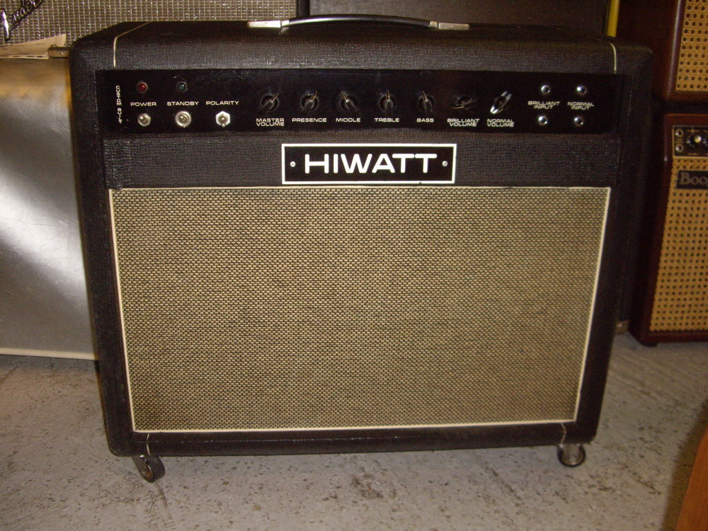 2x12" Hiwatt “Fane-Purple-Lable” Speacker, Normal & Bright Channels Four Inputs Controls: Normal Vol, Bright Vol, Bass, Treble, Middle, Presence, Master Vol Preamp Tubes: 12AX7 x 3, 12AT7 x 1 Power Tubes: 2x EL34 50Watt, basket weave. The back panel is missing. A real STRONG SOUND !