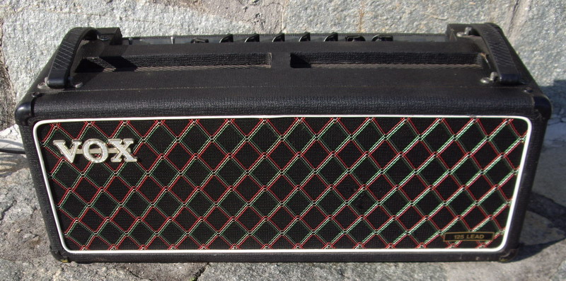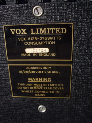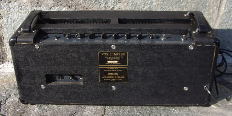 The V125 amp design included Gain, Volume and Master Volume controls, as would a Marshall amp from this same period.A five band EQ with rotary controls was featured in the V125. The EQ frequencies of the V125 Lead were 100hz, 250 hz, 500 hz, 1600 hz and 2300 hz. The EQ frequencies of the V125 Bass were 50hz, 100 hz, 250 hz, 500 hz and 1600 hz. The electronics for the V125 were an adaptation of the circuits used in the AC-120 that Vox had introduced in 1973. Although Vox literature showcasing this amplifier states that it had "pure valve power," that is not totally correct. Two 2N3819 transistors were used as an initial gain stage in the V125. After the transistors, two ECC83, one ECC82, ome ECC81 and a quartet of EL-34s made up the tube complement.The V125 amp design included Gain, Volume and Master Volume controls, as would a Marshall amp from this same period. Size (Head) 26" W x 10" H x 10" D