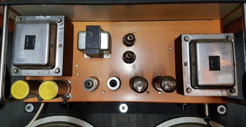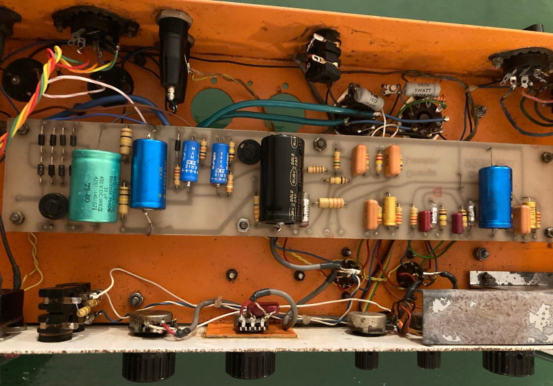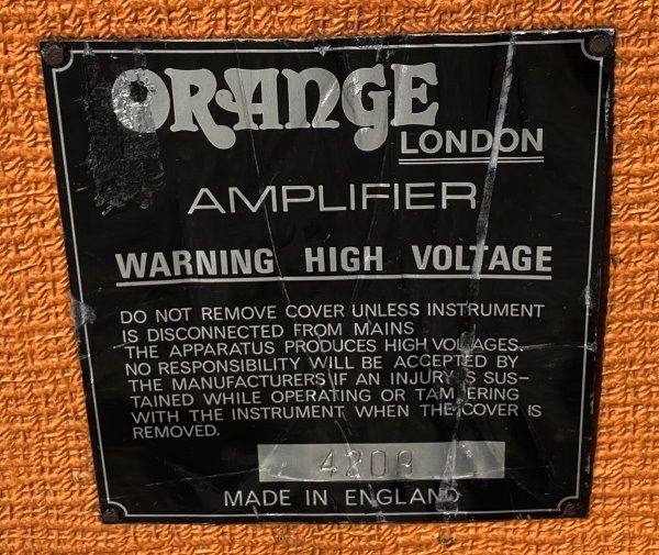 The rare “pics only” Orange series, of which this is one, ran for just a few years. The descriptor names the control panel’s rather obvious feature susing graphic illustrations to depict functions, with no text whatsoever. These graphics include a jack plug above the two inputs, sound wave icon above the F.A.C. (frequency analyzing control), a bass clef above the bass control, a treble clef above the treble control, a fist above the H.F. Drive (high-frequency), a speaker pumping air above the Volume control, snow-capped mountain peaks with reflected sound wave above the effects loop’s send and return (often dubbed “echo” in the day), and a cartoonish electrical “zap” above the power switch.