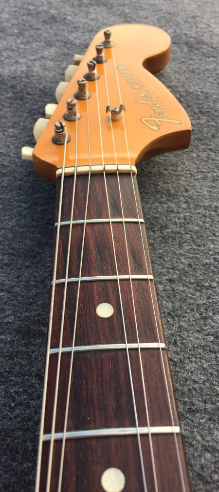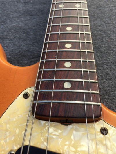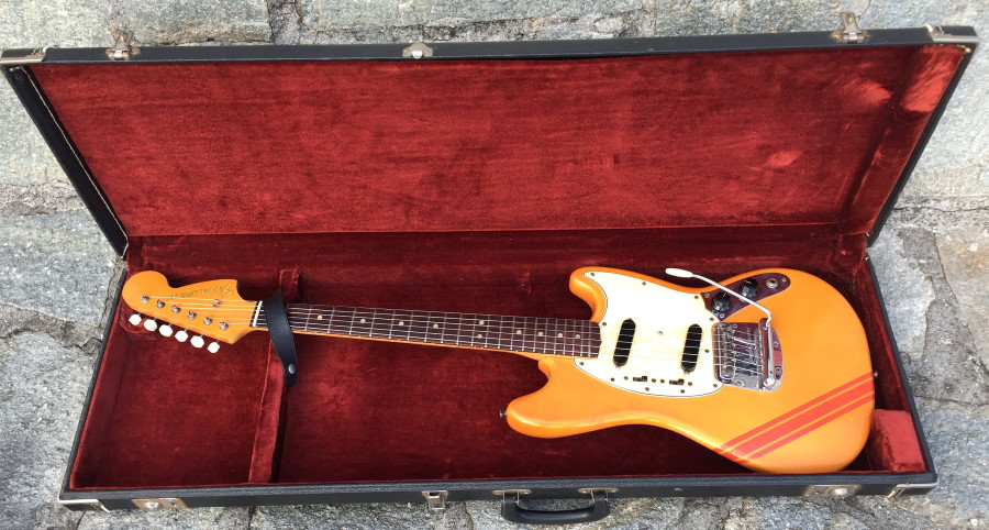 This is NOT a Japan Reissue.The rarest of all the Mustang, this is a 1969 Fender Mustang Yellow Competition Matching Headstock with Racing Stripe finish, alder body, maple neck, rosewood fingerboard. As with all the Yellow competition, it turned a beautifull dark orange. Pearloid pickguard this Mustang is 100% originl and comes with its original hardcase. Straight neck, low action. Original pickups have that classic Mustang tone that is warm, clear and jangly.