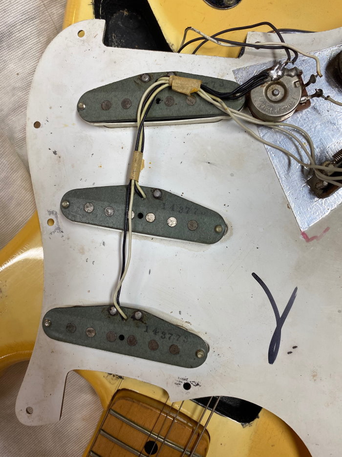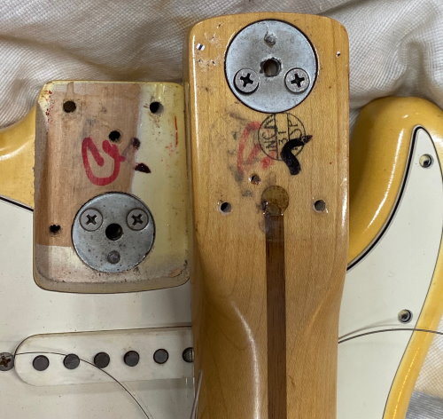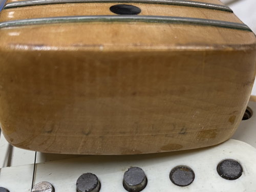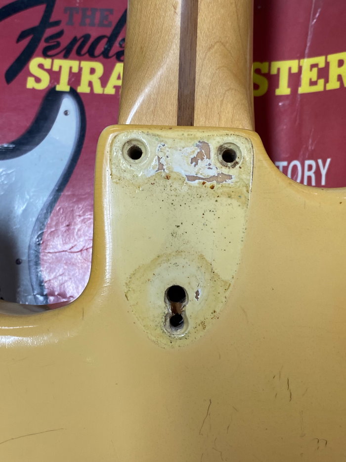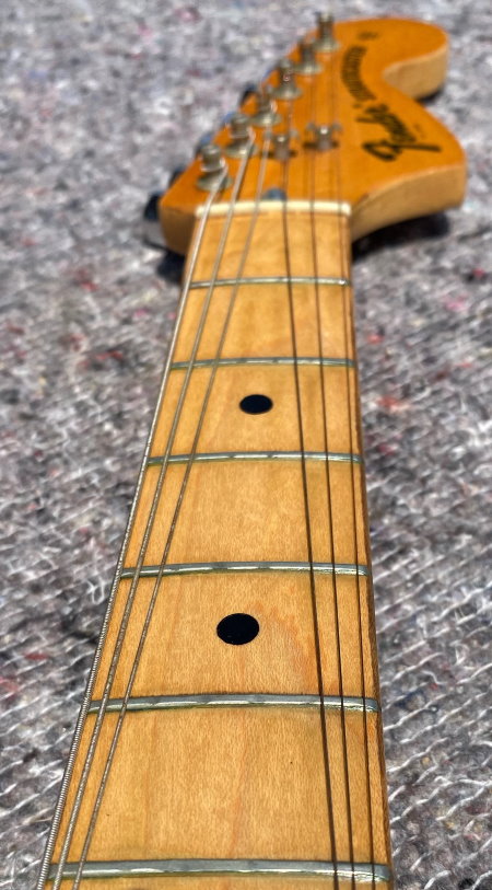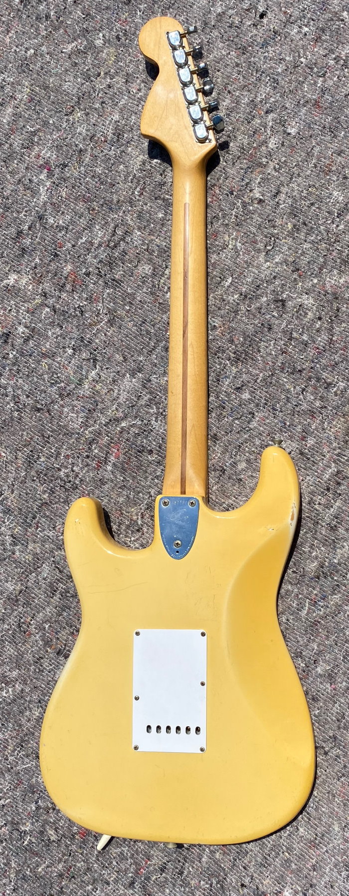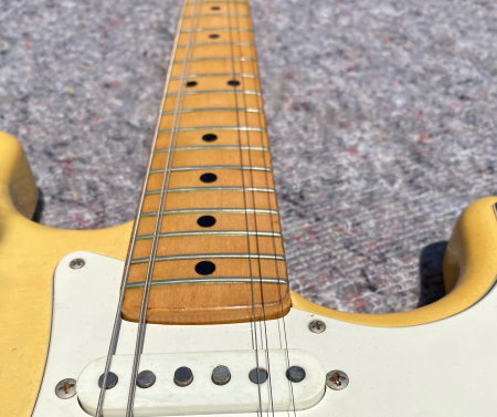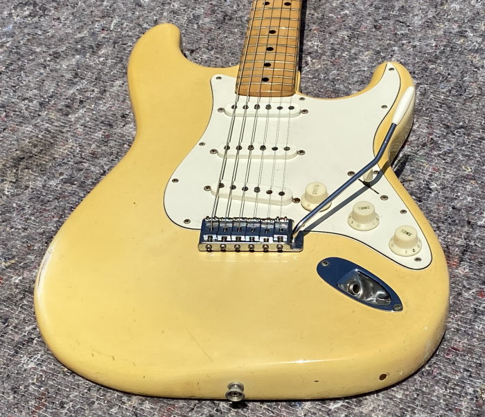 1973 STRATOCASTER, Olympic White, CUSTOM COLOR All Original, stag pole piece, white pickguard, Maple Neck Good frets a real super conditions as you see in photo. The previous owner put graphite inside the cavities of the body classic action in the 80s and 90s period if you want you can remove it, under the white it is intact. Frets are still usable 80-90% Pots date 1972 Pickups Date 1973. Comes in a period "Polverini" Case Made in Italy for Fender red interior. (code FE9899)