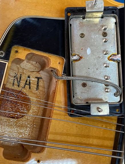 All Original Maple body and top, and the back is one piece Maple too. The neck is Mahogany 60s Style "C-Shape" with perloid DOT-Inlays. Perfect and original frets . Gibson Nashville Tune-O-Matic Bridge. Patent Number Humbuckers 6x orig. Grover tuners Nickel hardware. Comes with original brown hardshellcase with pink lining and tag. weight 8.4 lb Nut: 43,2 mm