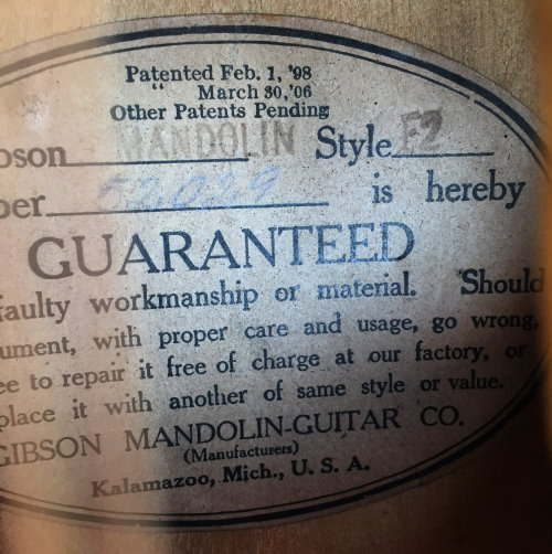 The Gibson F-2 appeared in 1902 and was built until 1934. It was one of the results of Orville Gibson’s inspired blending of violin, mandolin and guitar construction styles, which influenced many subsequent designs. The F-2 has an oval sound hole, which is now found only on A-style instruments. The oval soundhole was also found on many arch-top guitars until the mid 1930s, and afterwards it was replaced with F-holes almost universally.