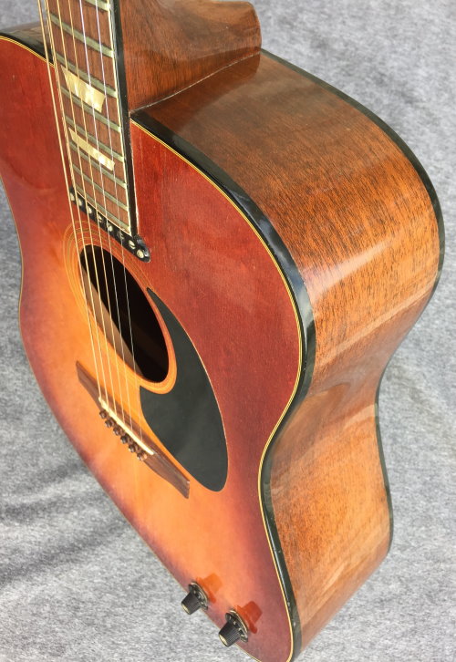 mahogany back and sides, a rosewood fingerboard, trapezoid inlays, and a