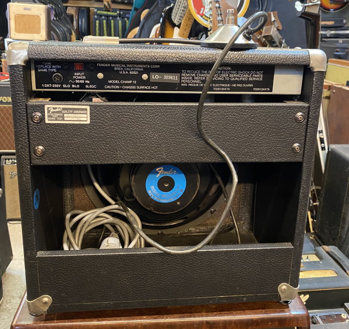 80's Fender Champ 12 Red Knob - Made in USA - class A tube original 12" Fender special design (Eminence) and good power with its 15W. Weight 10Kg. Perfectly functional, same dimensions and performance as the Princeton, but with 12" cone ! Excellent choice for having the classic Fender tube sound, with good power and low weight. Code Am02