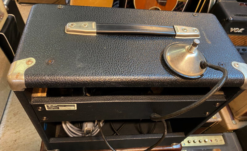 There's a lot of talk about small tube amps for recording or home. This little tube which "features a unique CLASS-A type output section" as the original manual states, has 10 watts rms, two 7025 Fender Special Design tubes as preamp and a 6L6GC also Fender Special Design as power amp. It has two channels, a spring reverb and a twelve speaker. The controls are volume, bass, treble (with a boost for the mids), gain and volume for the second channel and reverb. The outputs include a stereo tape out, an output and a headphone output.