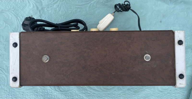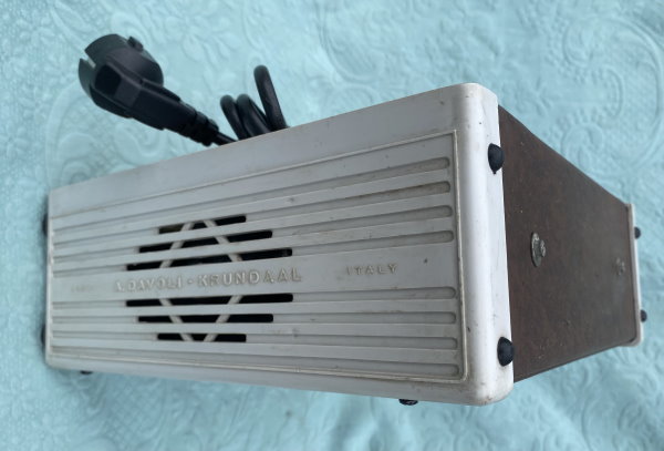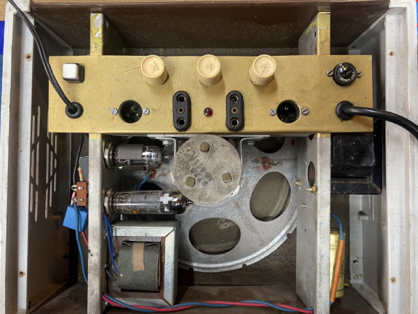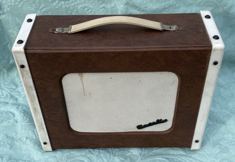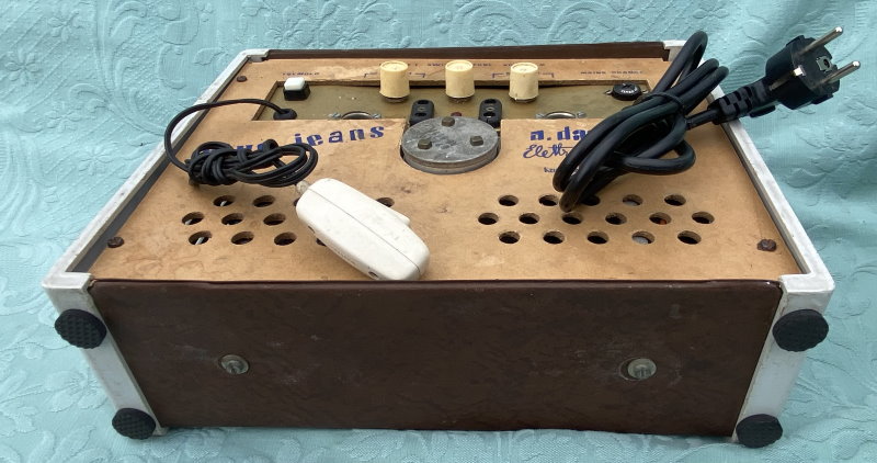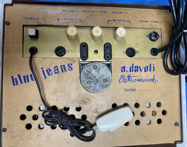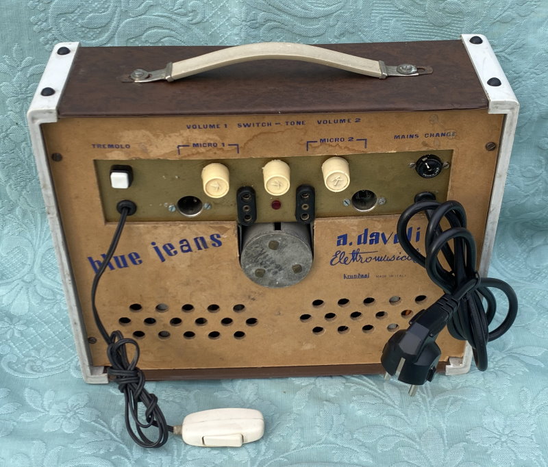 This is a particularly charming Italian "Davoli" Krundaal Blue Jeans Combo 1×8″ 15-watt tube amp. Usually this amp was sold with a Wandré guitar. Original Geloso Input Jack.