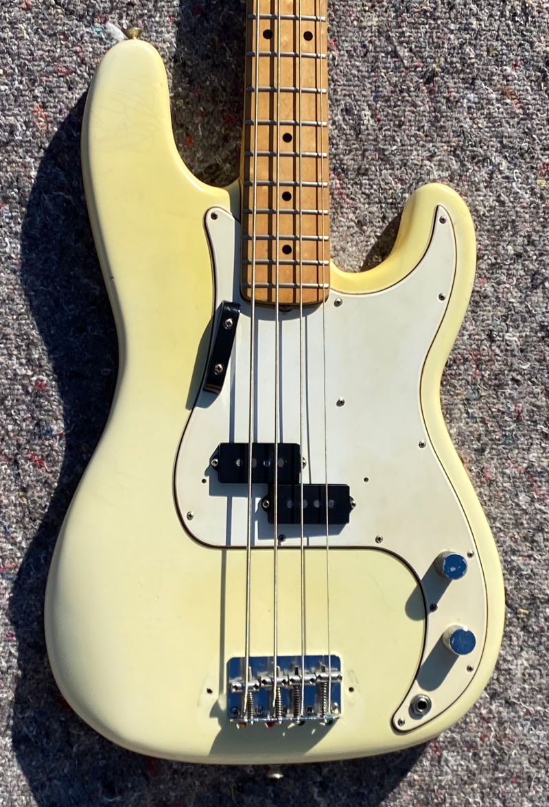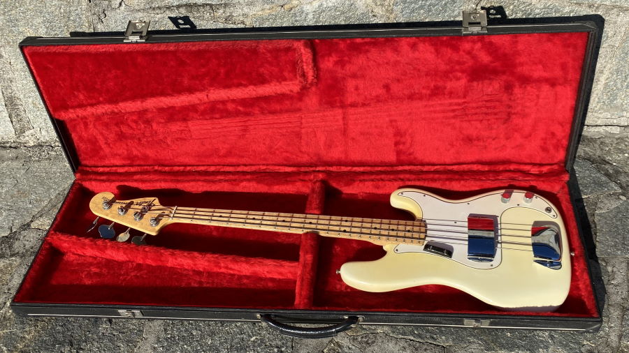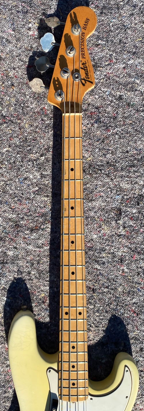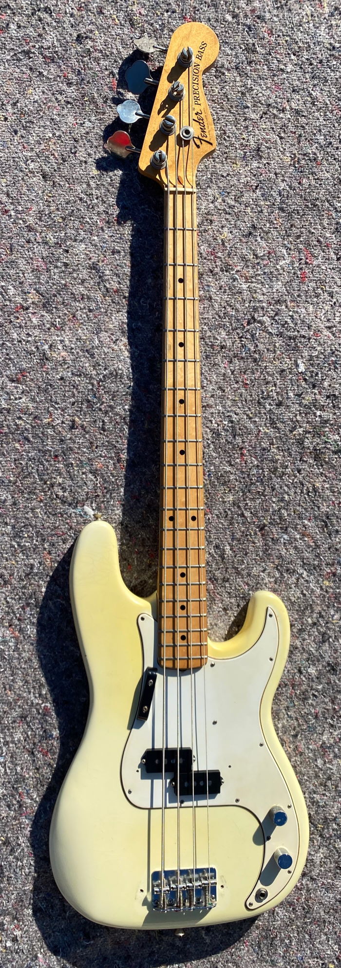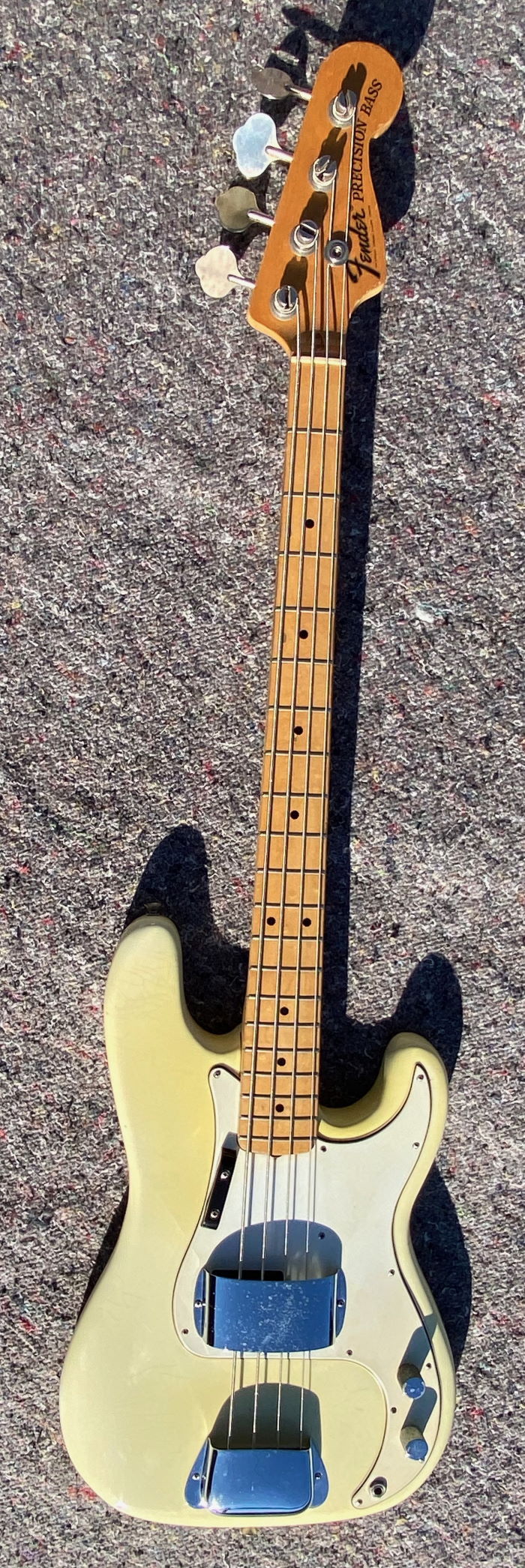 1974 Fender Precision Bass Olympic White Maple Neck in Excellent Conditions All Original, Pickup and pots dating 73 A stunning straight neck, fast fingerboard with low action and with very good frets ready to play no buzz. Original P-bass pickups are warm and fat and percussive with that distinctive P-bass tone !!! Comes with vintage original "Poverini" Made in Italy For Fender black tolex case Code Ba02
