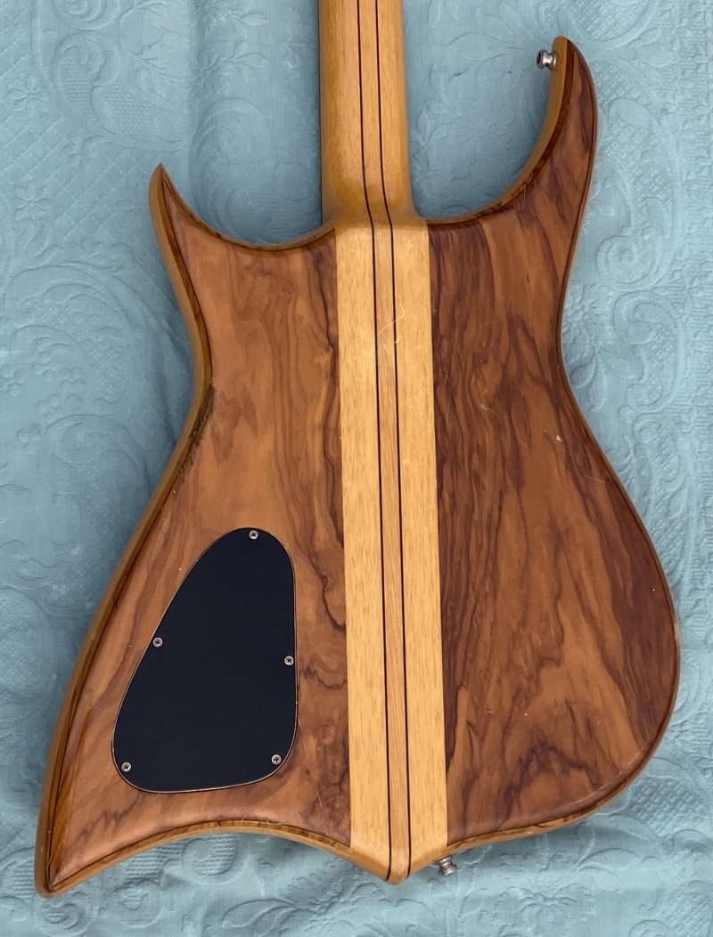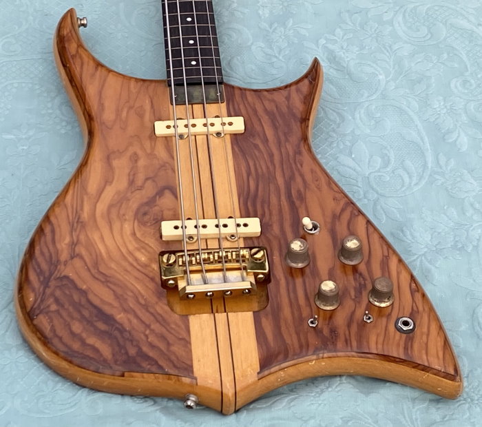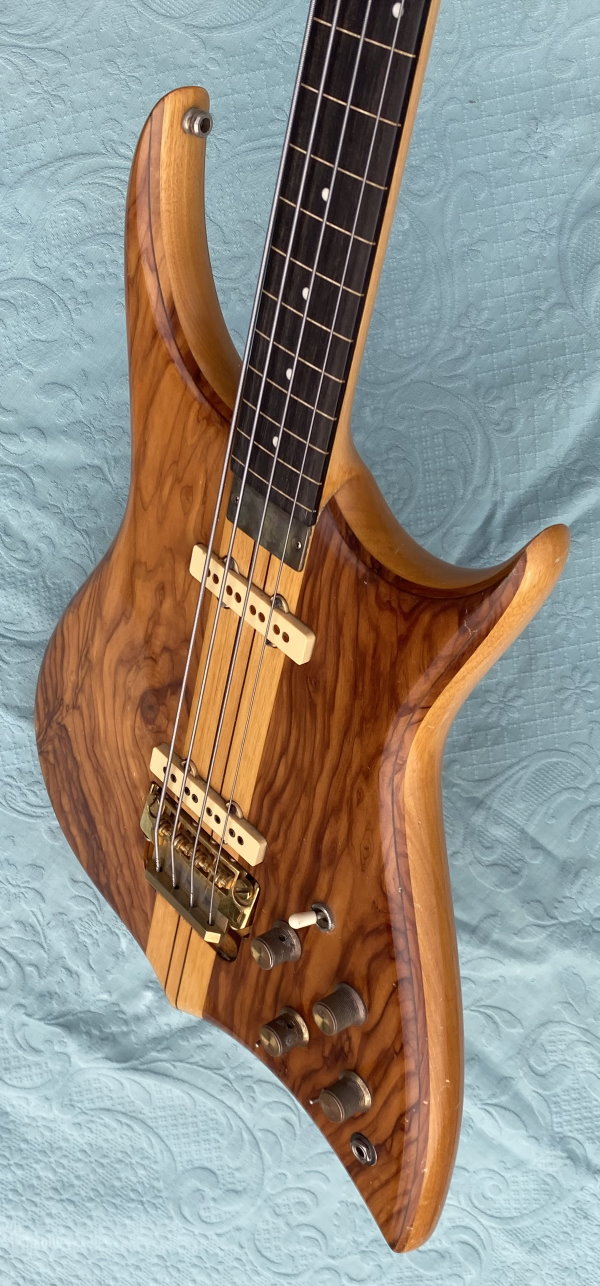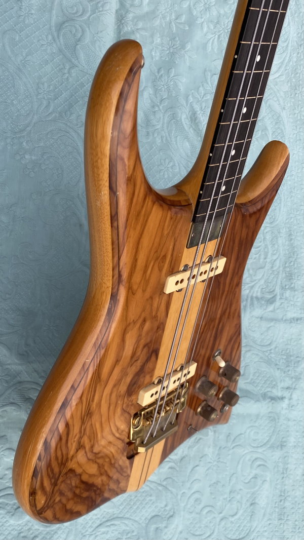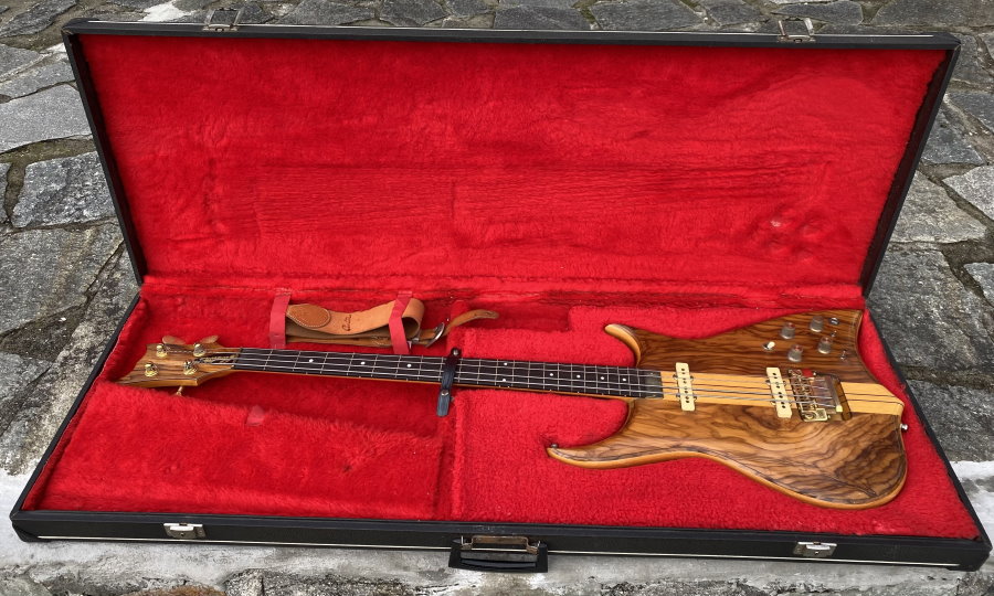We are selling this gorgeous and super rare electric bass built in Italy by the famous luthier, Pino “Ronton” Rotondo in 1982. Fully working with Di Marzio pickups selectable via 3 switches and two micro switch, so as to allow all possible combinations! . Cosmetically it’s very beautiful as you see in photo! The fingerboard is built in a very beautiful and compact Ebony. The neck is perfect and very comfortable with the nut made of brass. Shaller tuning. The bridge is original and is a very rare “Shaller”! Body: Olive/Ramino/Olive Sandwich Neck: 5-piece neck-through, Ramino/Ebony Comes in Original Case and rare original bass leather strap with the "Ronton" brand. Excellent instrument for those looking for a particular and unique bassr with a very good sound.