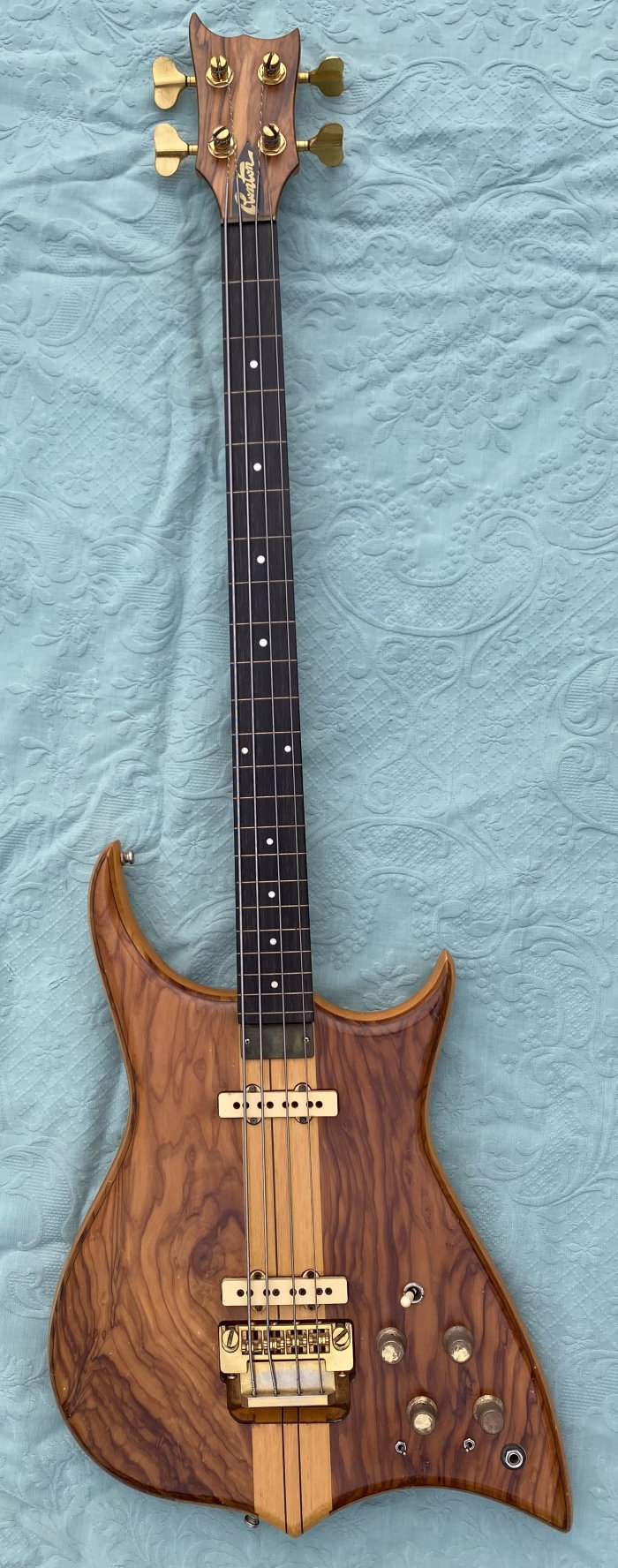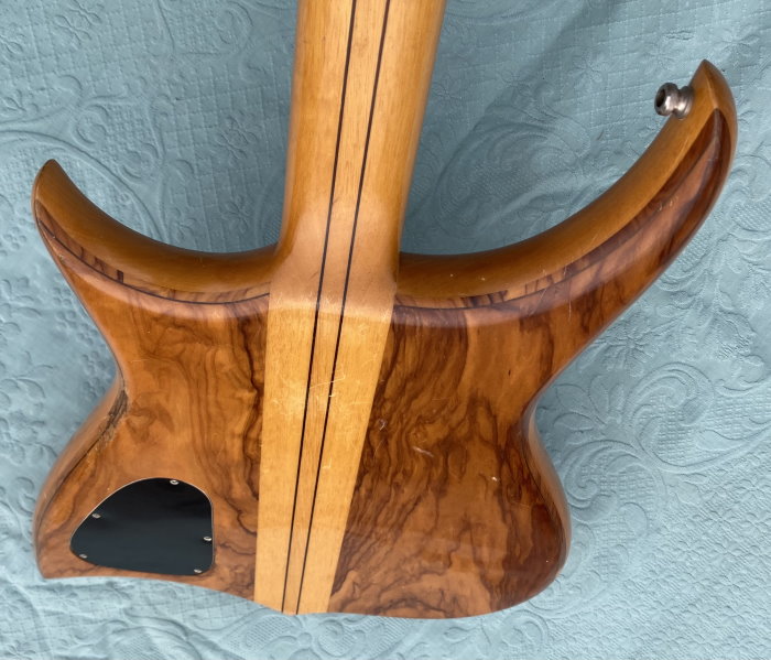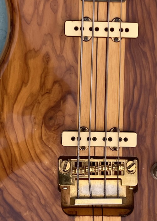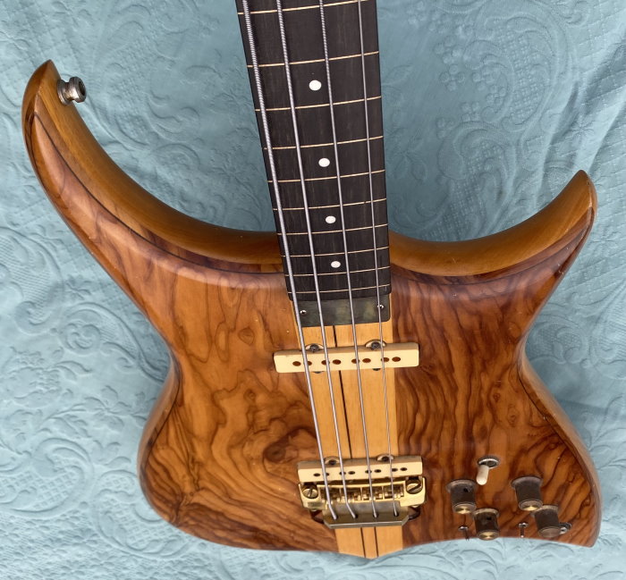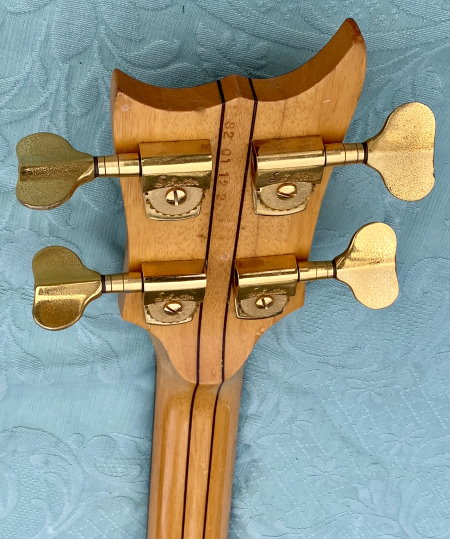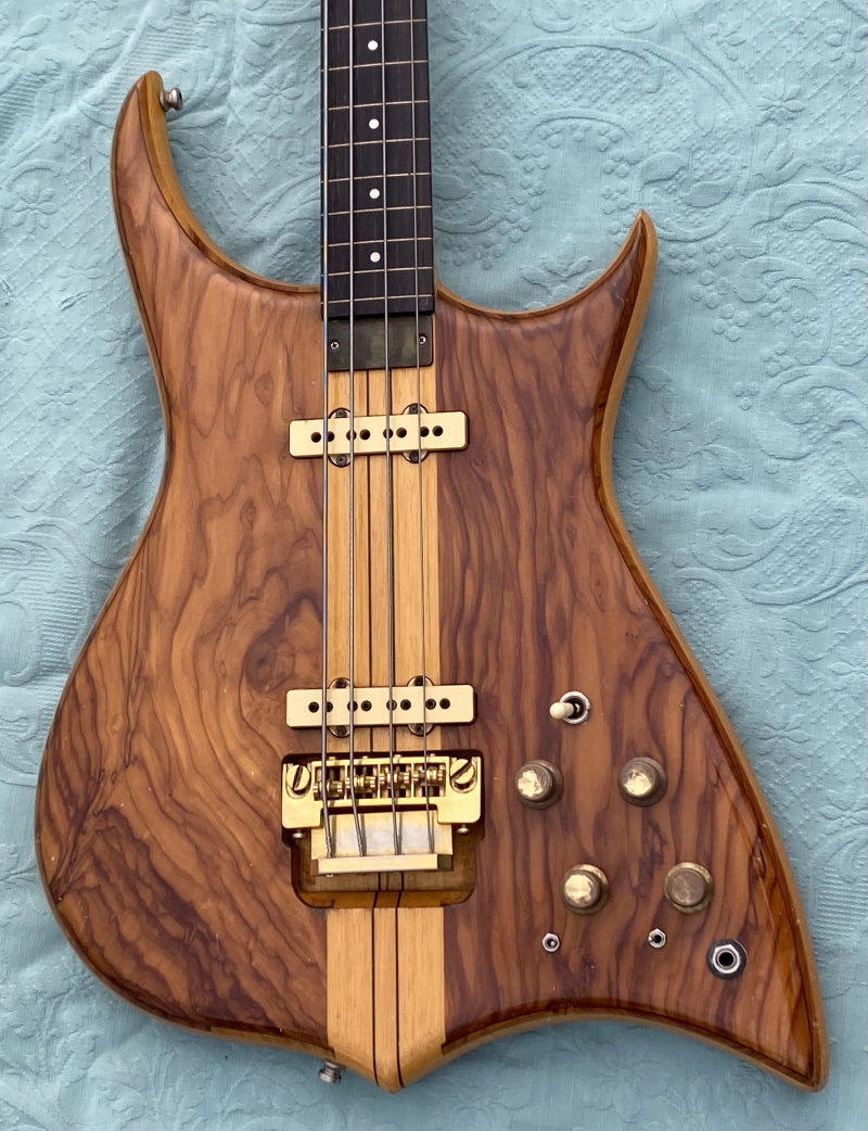 We are selling this gorgeous and super rare electric bass built in Italy by the famous luthier, Pino “Ronton” Rotondo in 1982. Fully working with Di Marzio pickups selectable via 3 switches and two micro switch, so as to allow all possible combinations! . Cosmetically it’s very beautiful as you see in photo! The fingerboard is built in a very beautiful and compact Ebony. The neck is perfect and very comfortable with the nut made of brass. Shaller tuning. The bridge is original and is a very rare “Shaller”! Body: Olive/Ramino/Olive Sandwich Neck: 5-piece neck-through, Ramino/Ebony Comes in Original Case and rare original bass leather strap with the "Ronton" brand. Excellent instrument for those looking for a particular and unique bassr with a very good sound.