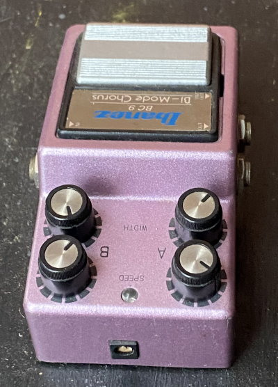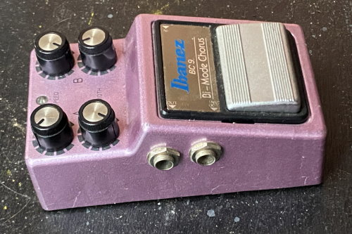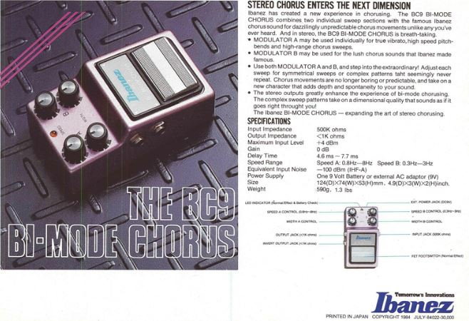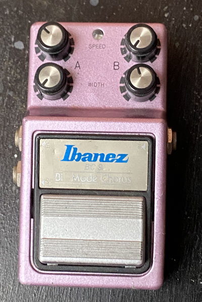 Utilising Panasonic BBD MN3102 and MN3207 chips, the Ibanez BC 9 Bi-Mode Chorus features two oscillators, two outputs, two speed adjustments and two width adjustments. Made by Maxon Japan.
