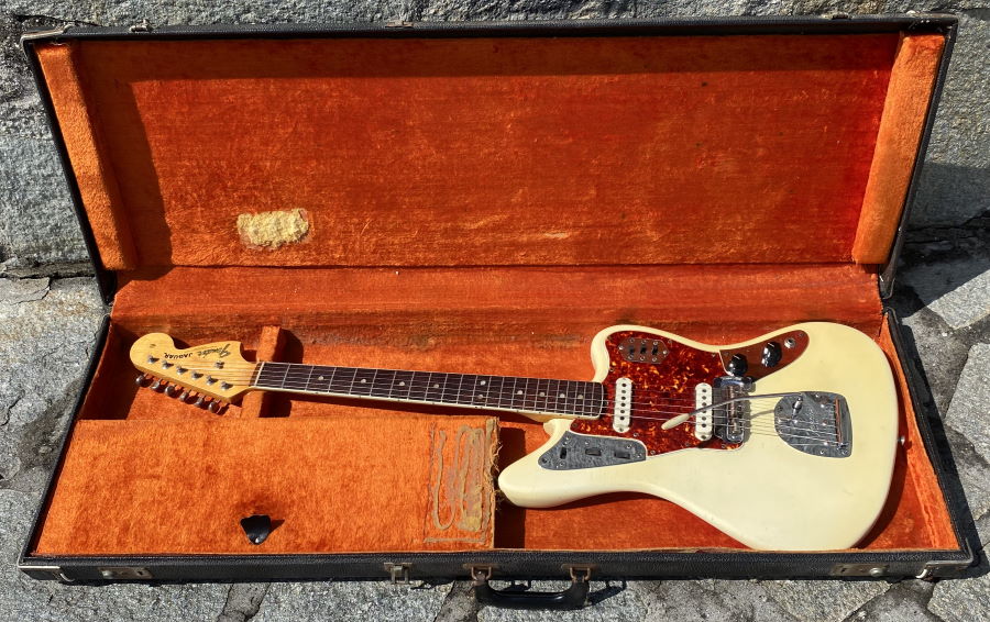 Stunning Jaguar in Custom Color Olimpic White with minimal weather checking, 100% original, transition model with dots and binding, original frets in very good condition, ready to play, original case.. the Jaguar sound..!!!