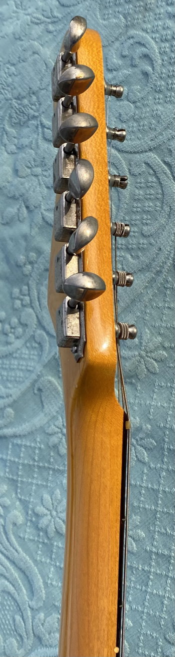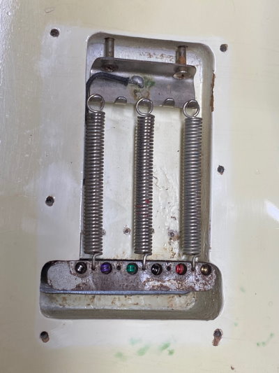 Solid alder body in Olympic White (finished), One-piece maple neck + small pre/cbs headstock, Rosewood fingerboard with 21 frets, Pearloid dot inlays, 3 original "Black-bottom" single coil pickups, 3-ply white pickguard, 1x volume, 2x tone, 3-way switch, 6x original Kluson "double-line" tuners, Fender "synchronized" tremolo with 6 steel saddles "Pat.nr.stamped",