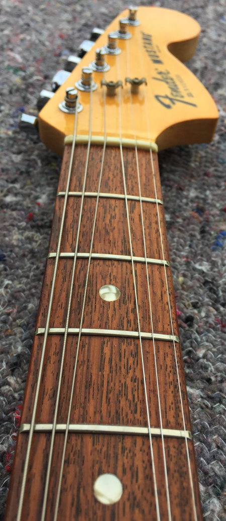 Completely original in stunning condition for a nearly 45 years-old instrument ! It has been very meticulously maintained all its life, as you can tell by its remarquable looking condition. The guitar even has got its original tags ! Fast neck very easy to play with its low action. You could tell it just got out the Fender assembly line !It has very 70's tones deep and woody, with that snap quite representative of the Mustangs of this decade. The multiples pickups combination make it at ease in a lot of styles. Comes in classic italian hard case "Polverini" made for Fender