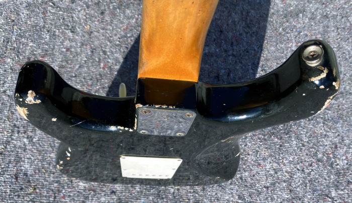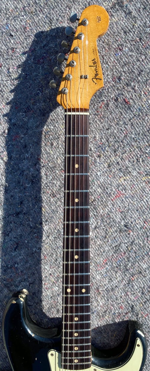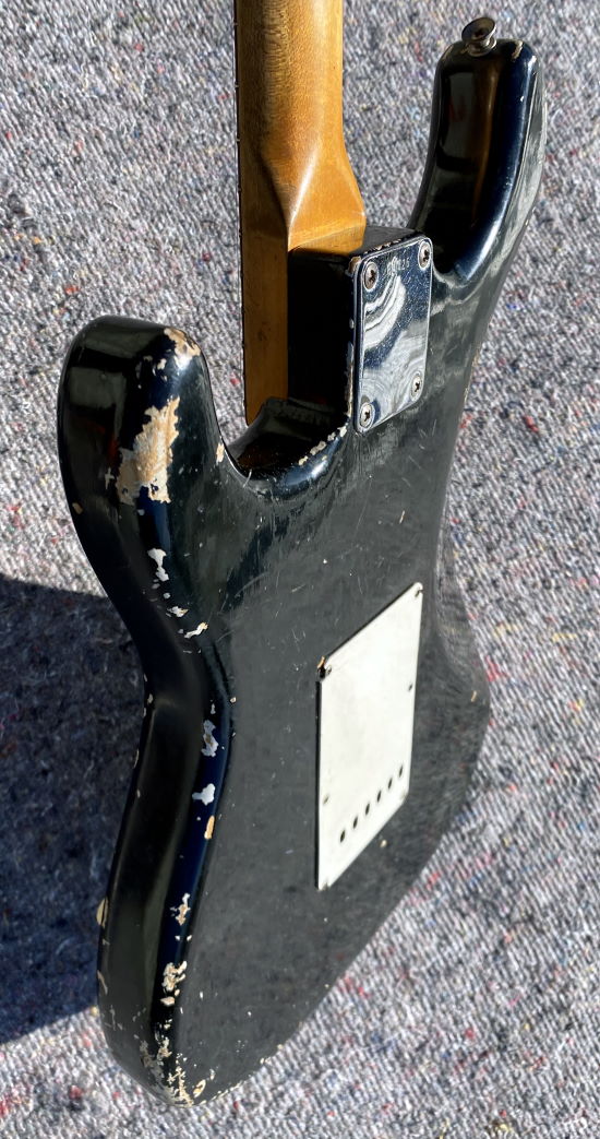 October 1960, serial number # 54426. This guitar was bought in 1980 from Guitar Trader in Red Bank New Jersey, exactly in the condition you see it today. by then, it was already20 years old and had been played and played and played.. refinished Black from the original Sunburst and showing the correct type of "whitish grey" undercoating used by Fender in the 1950's for their Custom Colors.. could have.. might have... being refinished by Fender early in it's life or shortly after..hard to imagine that at that time, some random person would be using the correct type of undercoating..?? at some point, before 1980, it was re-fretted professionally with correct frets wire. Fender-Fender saddles. the three pick ups are original with original windings. Reading Bridge 5,55 Middle 5,8 Neck 5,6 - Light weight 3,453 Kg, Original 3 way Switch, Original Tremolo and Pat.Pend Saddles..resonant..great sounding and playing vintage Strat with so so so much Mojo.. Comes in Original Fender Brown Case.