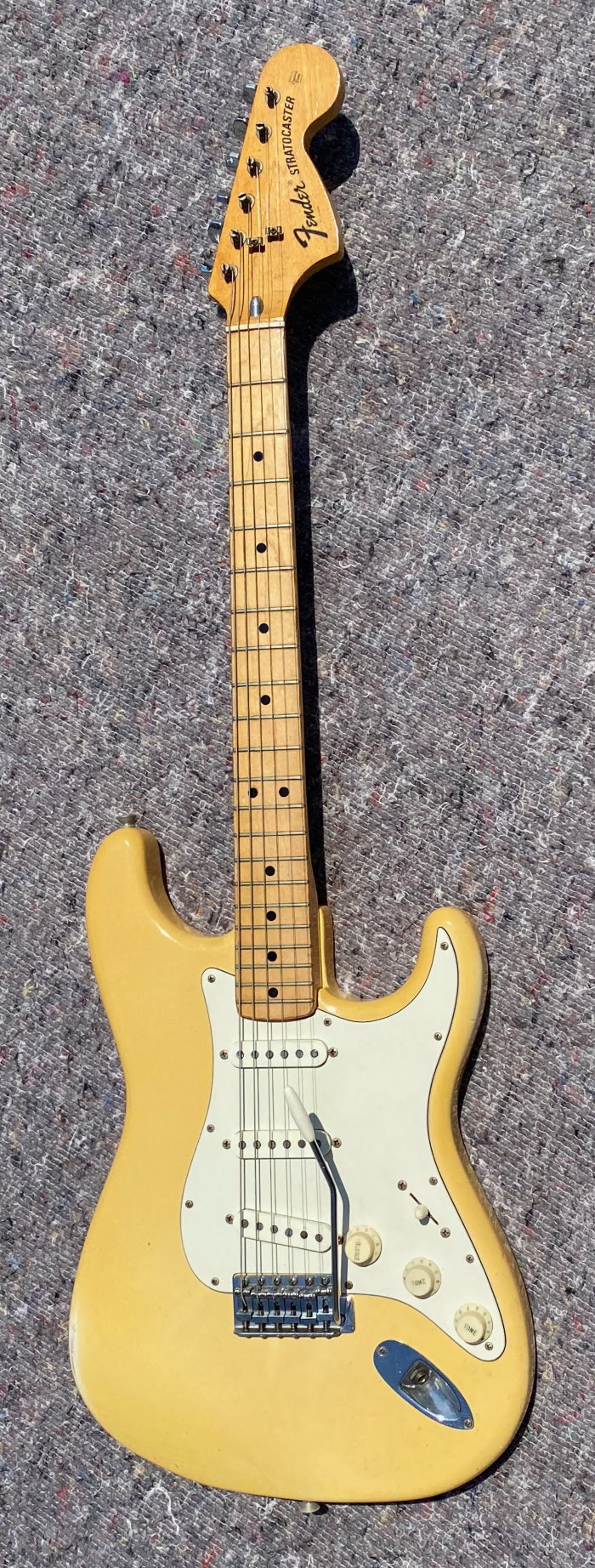 1973 STRATOCASTER, Olympic White, CUSTOM COLOR All Original, stag pole piece, white pickguard, Maple Neck Good frets a real super conditions as you see in photo. The previous owner put graphite inside the cavities of the body classic action in the 80s and 90s period if you want you can remove it, under the white it is intact. Frets are still usable 80-90% Pots date 1972 Pickups Date 1973. Comes in a period "Polverini" Case Made in Italy for Fender red interior. (code FE9899)