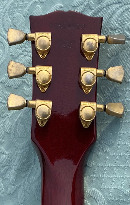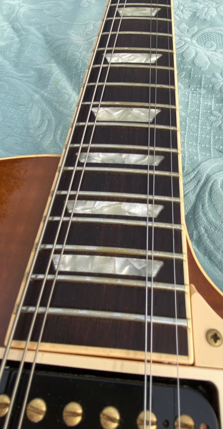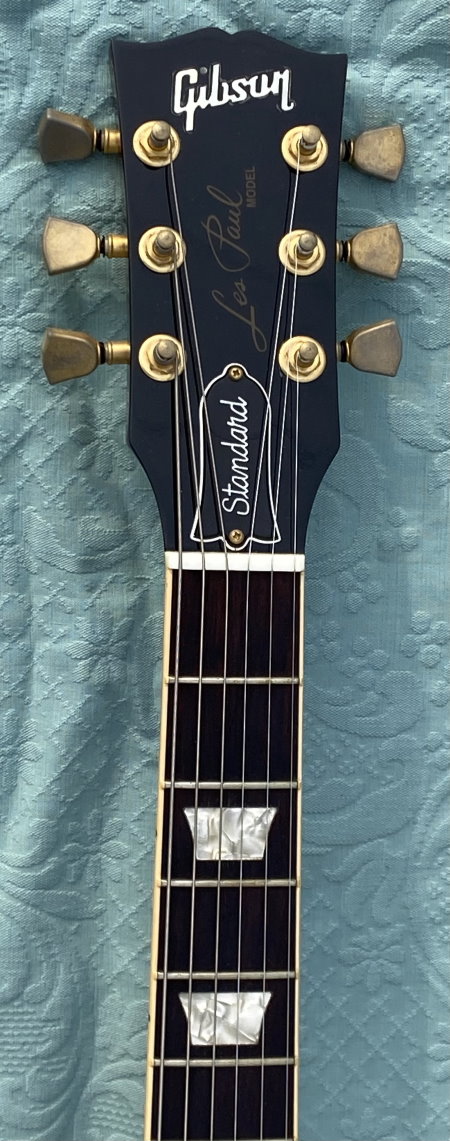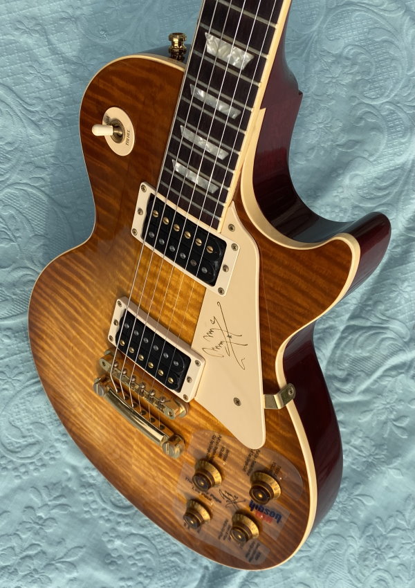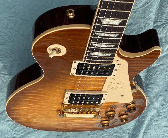 'first-run' Les Paul Jimmy Page Signature guitar has a nice fat nut width of just over 1 11/16 inches and a standard Gibson scale length of 24 3/4 inches. Just like Jimmy Page's original '59 guitar, the neck is thick at the nut and at the neck heel, like a typical 1959 Les Paul, but it tapers to a super-slim depth in the middle. Solid mahogany body with a nice 'tiger-stripe' two-piece carved maple top with single-ply cream binding. One-piece mahogany neck, and rosewood fretboard with 22 medium-jumbo frets and inlaid pearl trapezoid position markers. Two Gibson Ceramic Magnet Humbuckers. ABR-1 Tune-O-Matic retainer bridge with metal saddles and separate stud tailpiece. All hardware gold-plated. Apart from some very slight rubbing to the gold signature on the pickguard