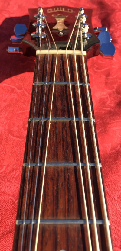 Good cosmetic condition: honest play wear with ding dong and exactly what you would expect from a 47 year old guitar. Medium profile mahogany neck with cream side-dots. Rosewood fingerboard with mother of pearl dot inlays. Frets are in great shape with practically no wear. Mother of pearl Guild & Chesterfield headstock inlays. Sealed tuners in perfect working condition. 1 11/16" nut width; 25 1/2" scale length. Neck is straight & truss rod works fine.Body: Square dreadnought body in natural finish. Solid spruce top with 5-ply binding. Rosewood bridge with bone saddle. Large tortoise pickguard & multi-ring rosette. Solid mahogany back & sides with cream binding. weighs 2Kg
