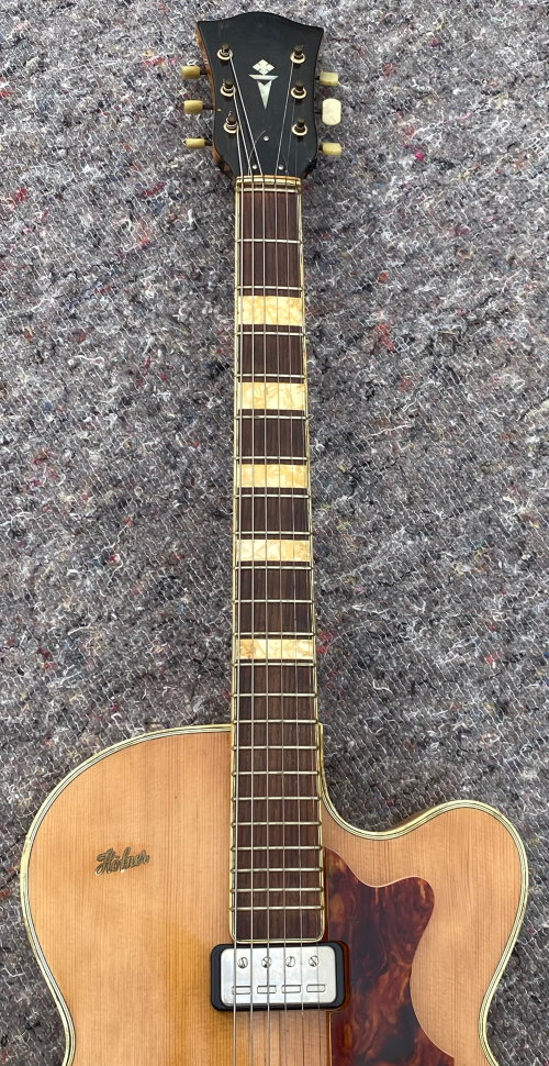 Interesting and groovy Hofner President it set up wonderfully with low action. Spruce Top/Figured Maple Back&Sides, Neck/Fingerboard 5 Piece Maple/Rosewood, Radius 9.5" Scale Length 25.75" Neck Profile D Neck Thickness .84"-1.01" New Circuit wiring and pots. Comes in a very bad broken case or very good Gig Bag..as you prefer.