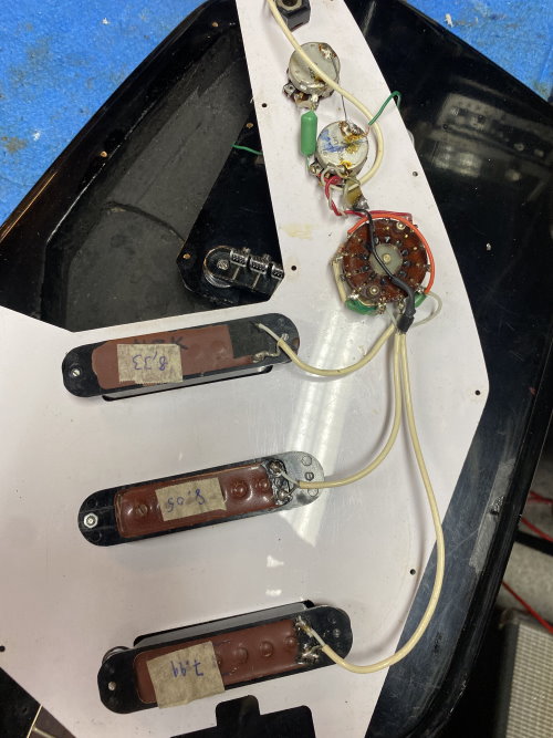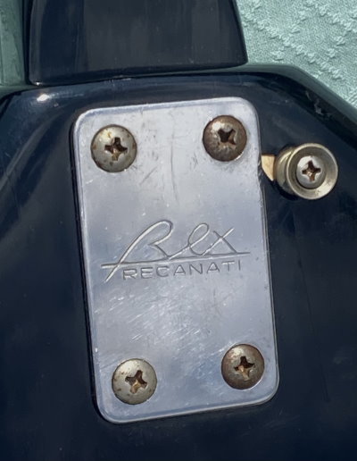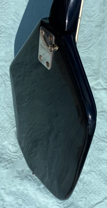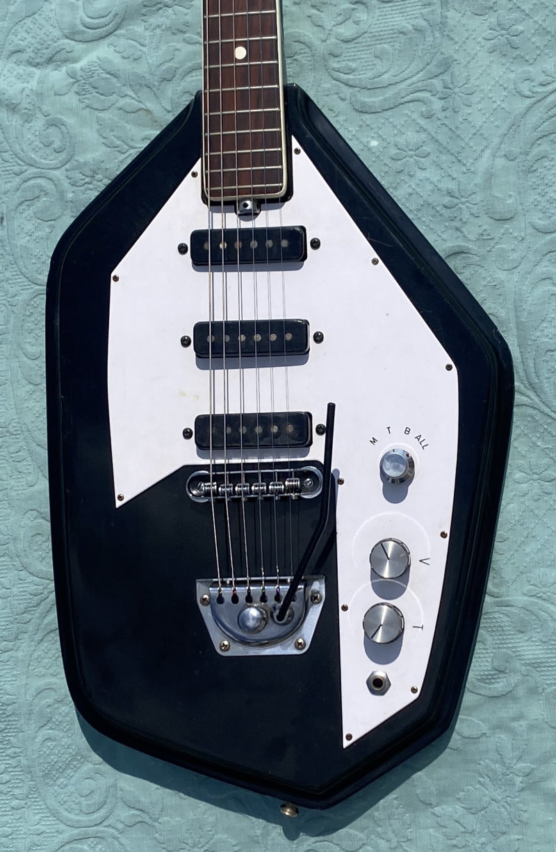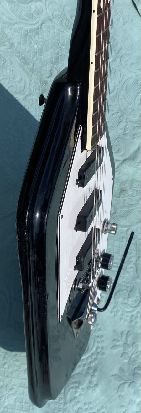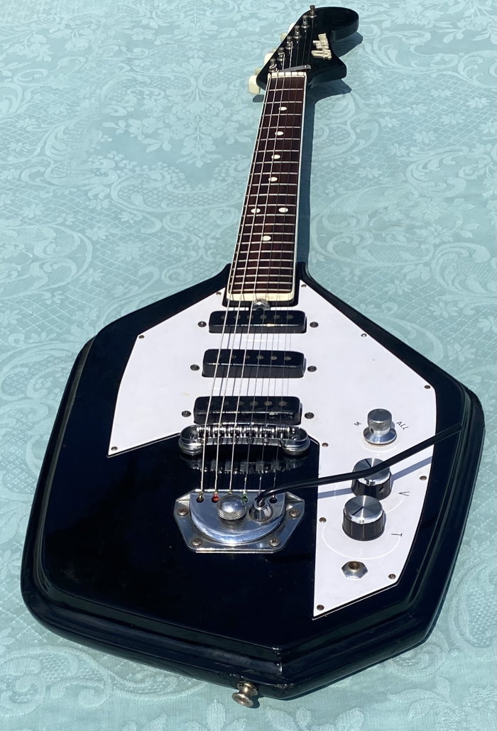 Nice and rare guitar Collectible guitar Made in Italy Recanati, Black, Very cool Body Shape 3 Pickups, Tremolo arm not original, one tuner replaced with a similar one, some ding&dong in the finish.