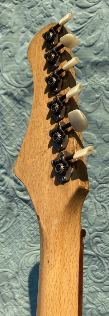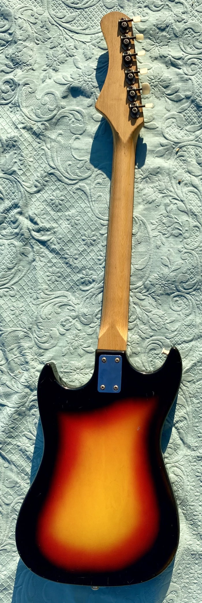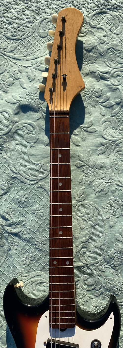Nice model with straight neck, rosewood fingerboard, good frets, low action, all working with 3 pickups single coil and tremolo. 3 Switch pos. Tone and Volum. "Rickenbacker sound" Comes in Gig Bag as you see in photo.