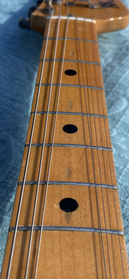 The frets are nearly virgin and so didn't need a level/dress. Its neck is